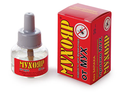 Средство инсектицидное электрофумигирующее «Мухояр» — жидкость от мух. Предназначен для уничтожения мух и других летающих насекомых (комары, москиты, бабочки, моли) в помещении. Разрешено к применению в присутствии людей. Безопасность для людей установлена научными исследованиями*.
