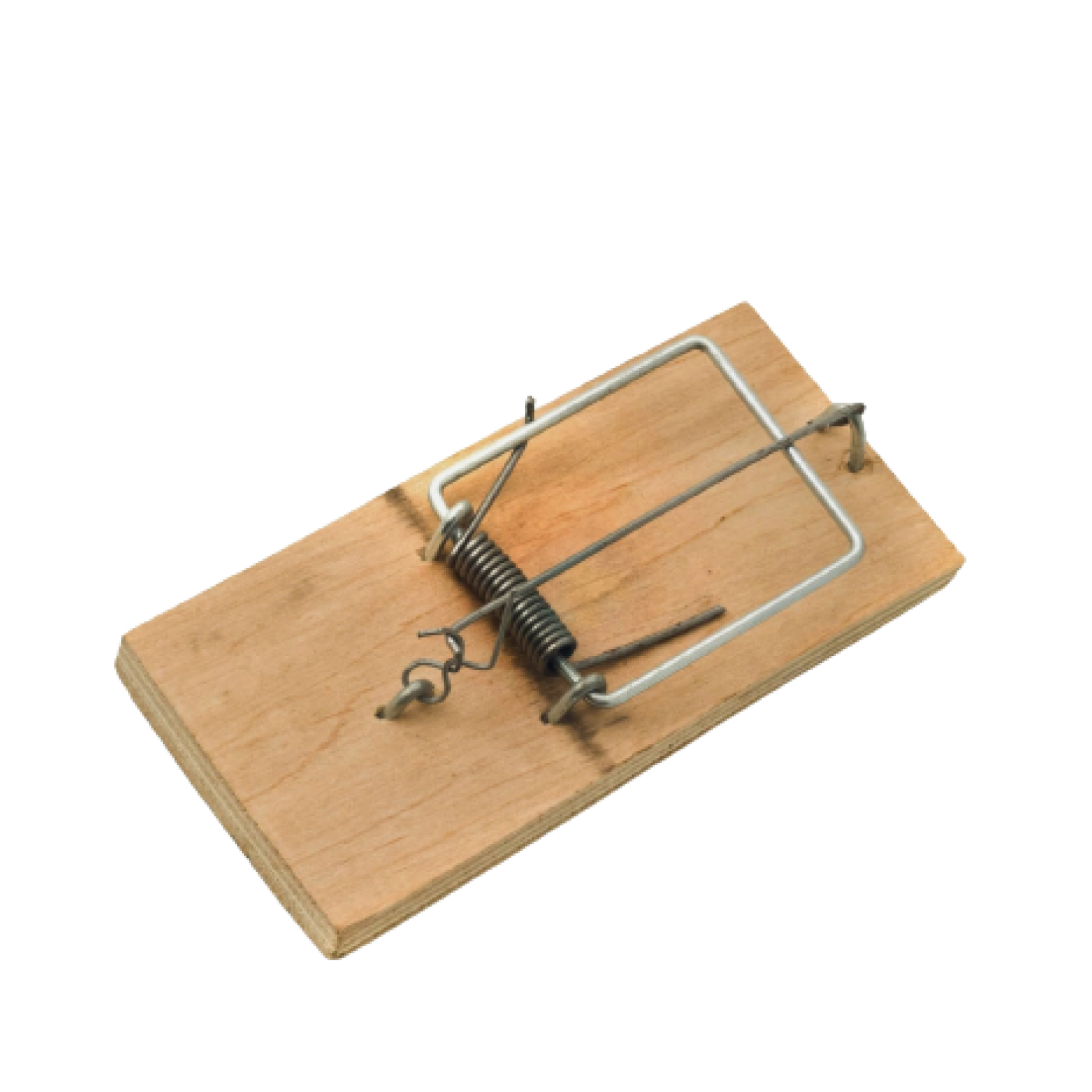 Мышеловка по сути является уменьшенной версией капкана для мелких животных, к разряду которых относятся мыши и другие виды из отряда грызунов. Она имеет основу из широкого деревянного бруска. Принцип действия мышеловки основан на использовании поражающего ударного воздействия, производимого рамкой при резком ее опускании. В нерабочем состоянии рамка находится на деревянной основе. Мышеловка приводится в рабочее состояние следующим образом. Нужно повернуть рамку вокруг оси ее вращения, на которой находится пружина, и закрепить в этом положении при помощи фиксатора. Фиксатор опускается поверх рамки и закрепляется за изогнутый конец крючка. На другой конец крючка насаживается приманка. Привлеченная приманкой, жертва дергает за крючок и высвобождает фиксатор. Не закрепленная теперь рамка под действием силы реакции пружины мгновенно возвращается в первоначальное положение, поражая жертву - мышеловка захлопывается.