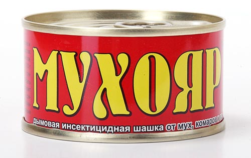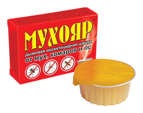 Привычное средство против летающих насекомых в хлевах, дворовый и хозяйственных помещениях являются аэрозоли (типа дихлофоса). Но, при всей эффективности, они имеют ряд недостатков. При обработке помещений надо защищать органы дыхания и слизистые, т.к. велик риск «нахвататься» ядовитых испарений. Обработка помещений с высокими потолками становится сложной. А если помещение большое, то и дорогой. Отдельная проблема - уничтожение осиных гнезд. При попытке обработать «осиный дом» аэрозолью, осы начинают агрессивно атаковать. Этих недостатков лишено новое средство «Мухояр» - инсектицидная шашка. Препарат представляет собой порошок в жестяной баночке. Способ применения прост: средство разместить внутри помещения и поджечь. Дымовая шашка интенсивно дымит (но не горит!). Дымление происходит в течение 1-2 мин после поднесения спички, и человек успевает покинуть помещение. Дым проникает во все щели и уничтожает спрятавшихся там насекомых. Одинаково легко обработать как низкие, так и очень высокие помещения. А при унич